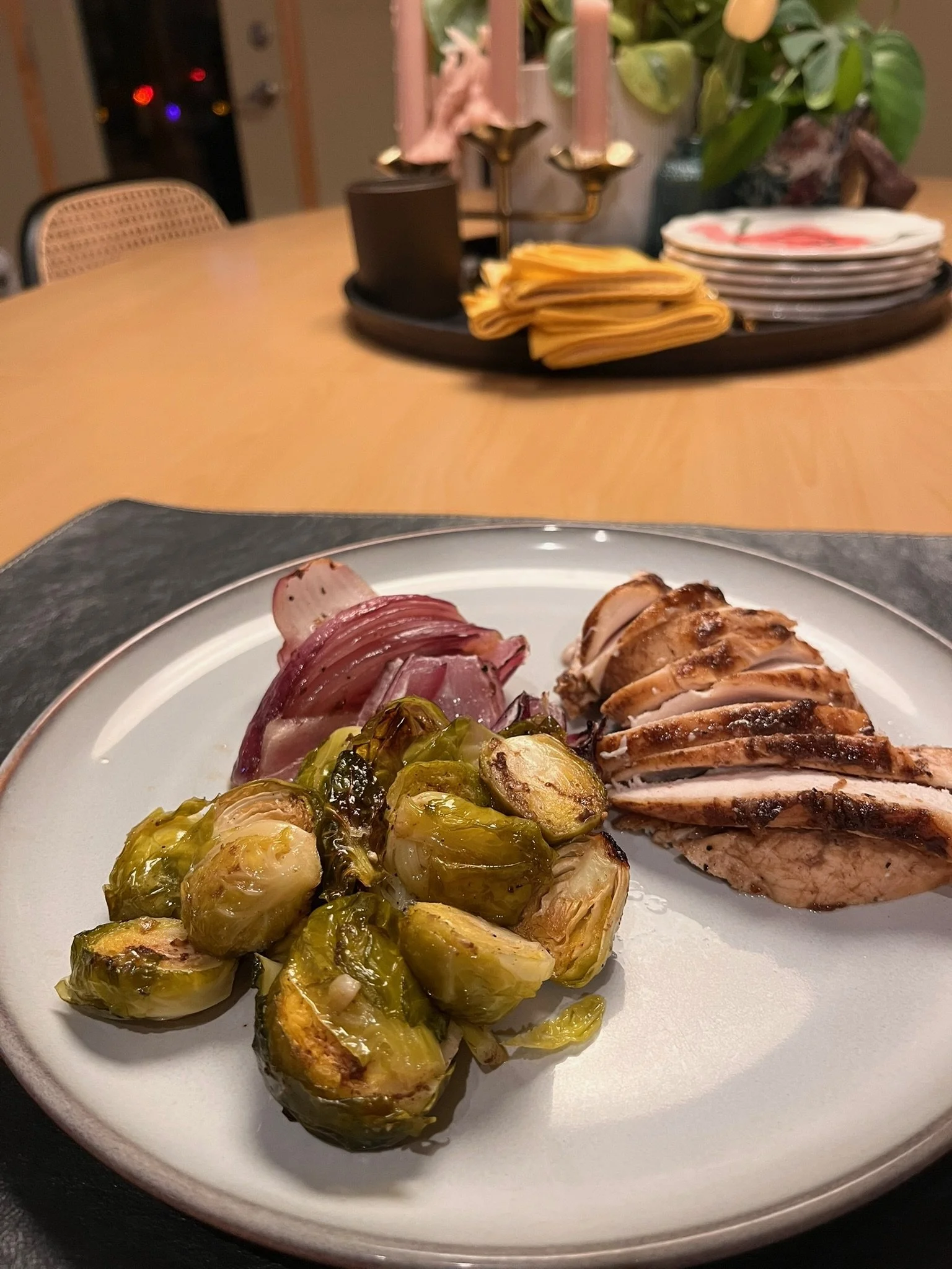 Preheat the oven to 425°F. Place the Brussels sprouts and onion on a sheet pan. Drizzle with the remaining 2 tablespoons of olive oil, and season with salt and pepper. Use your hands to mix everything together on the sheet pan.