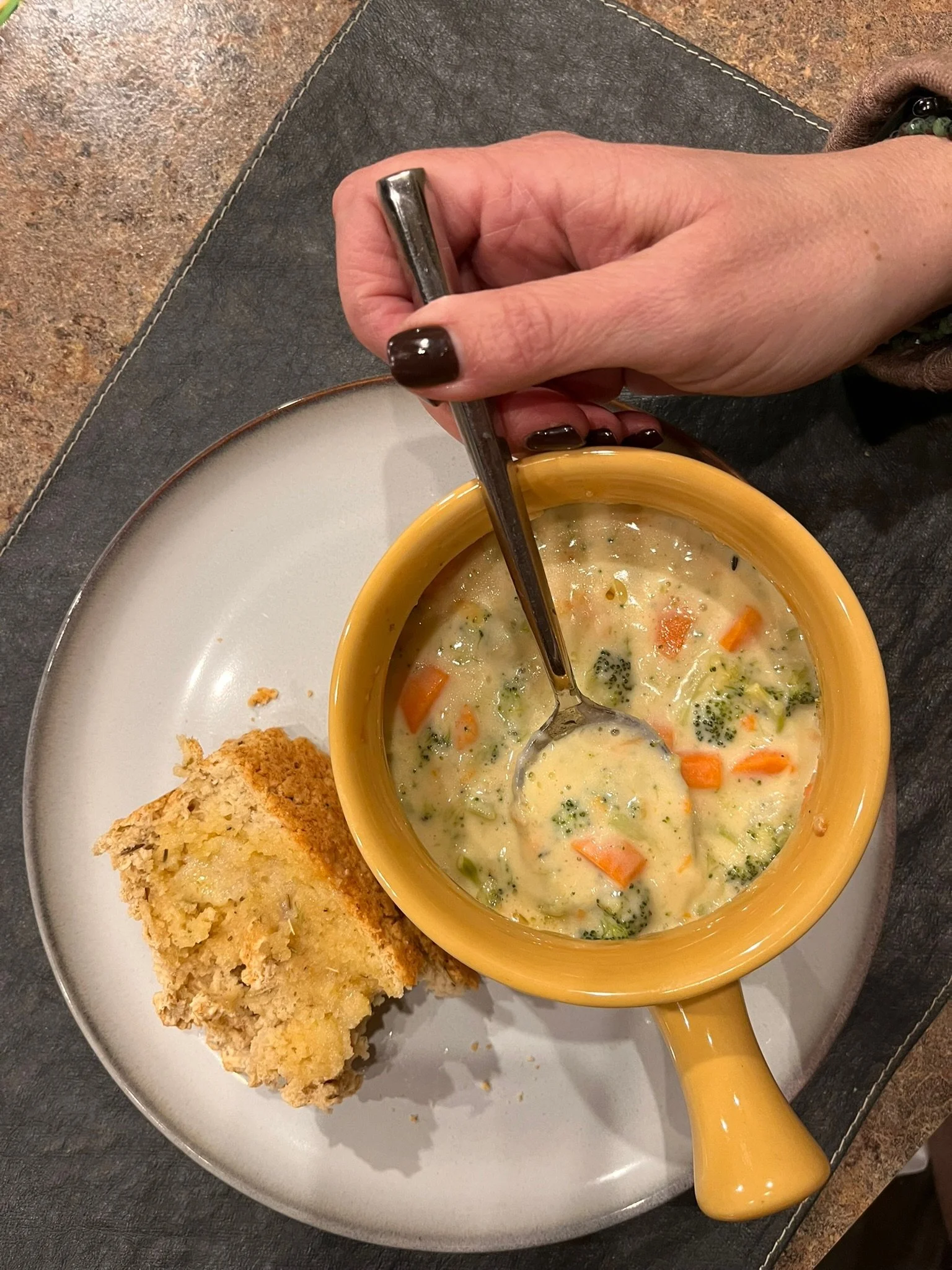Add the flour and cayenne, whisking as you do and cook until the mixture thickens, about 2 minutes. Gradually whisk in the broth, then the milk. Add the broccoli, bring to a simmer and cook until the broccoli is tender, about 10 minutes.