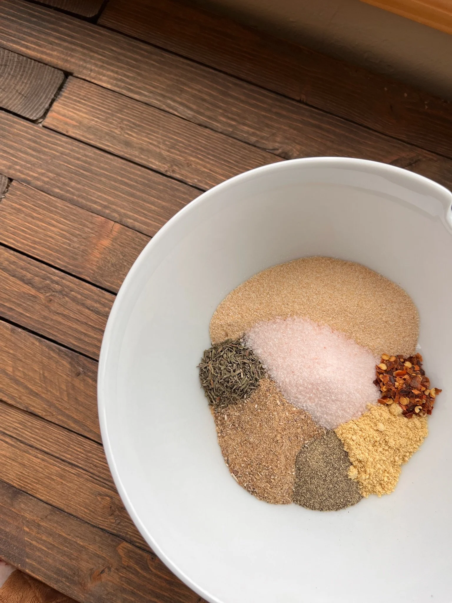 Add the granulated onion, mustard powder, salt, red pepper flakes, black pepper and thyme to a bowl with the mushroom powder.